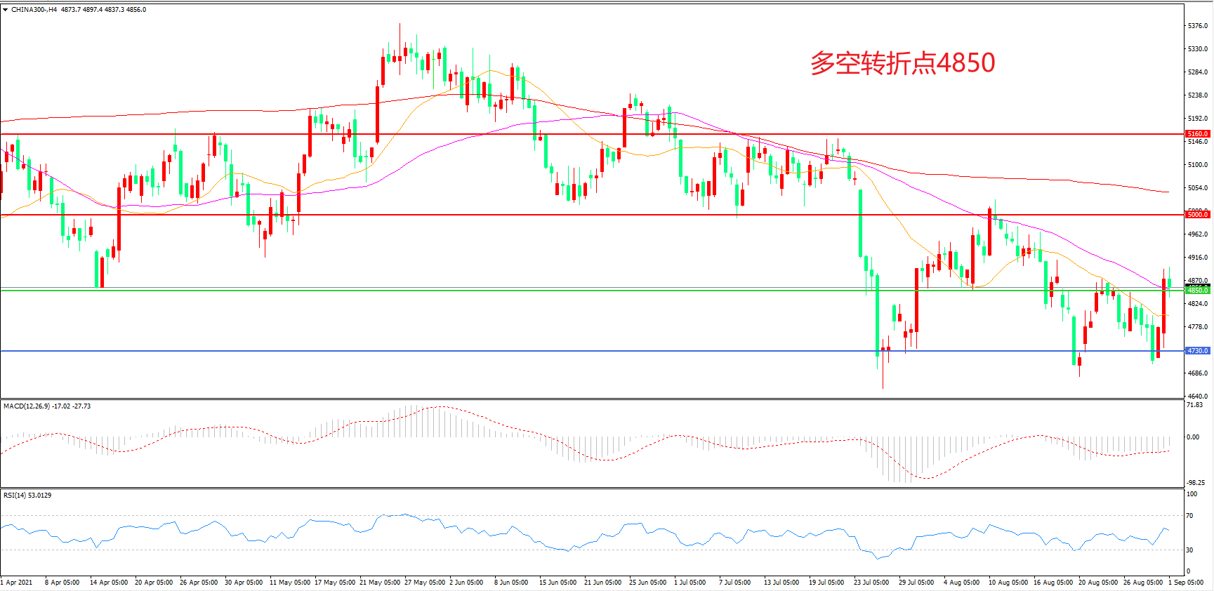 4小时图看,沪深300回踩4730支撑后连续拉升,下行趋势暂缓,均线系统阻力被顺利突破,MACD绿柱缩短,RSI指标走平,日内震荡上行概率较大。