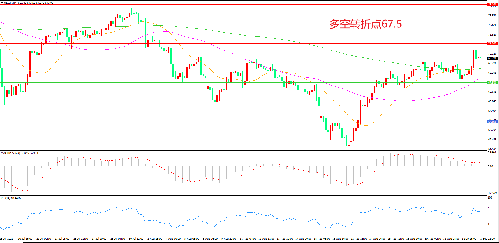 4小时图看,油价高位震荡后再度长阳拉升,整体表现偏强,均线系统成为下方支撑,71美元成为上方阻力,MACD红柱增加,RSI指标走平,日内震荡上行概率较大。