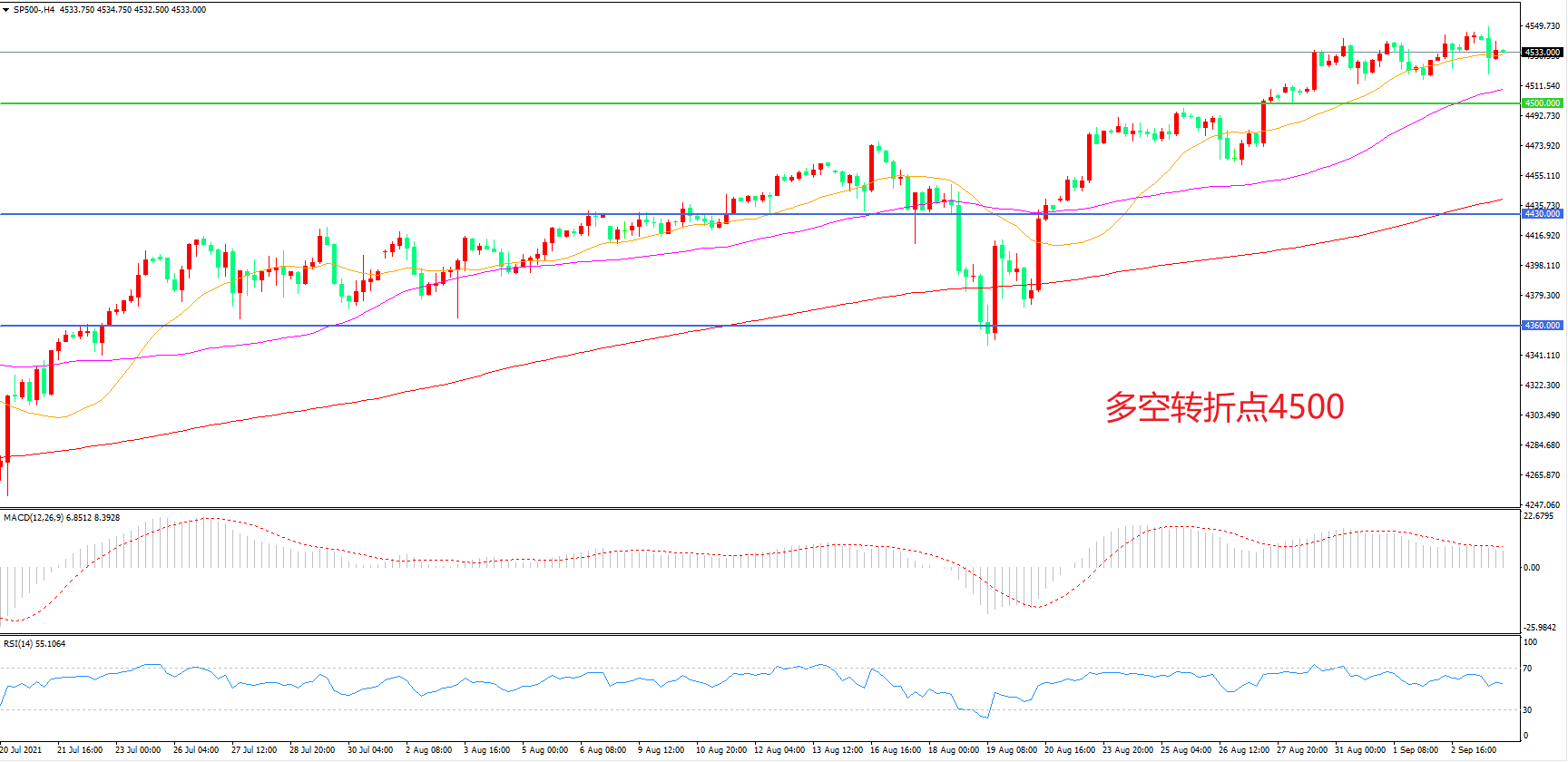 4小时图看,标普500高位震荡迹象明显,21周均线成为短线支撑,4500成为短期多空分水岭,MACD红柱增加,RSI指标走平,日内震荡上行概率较大。