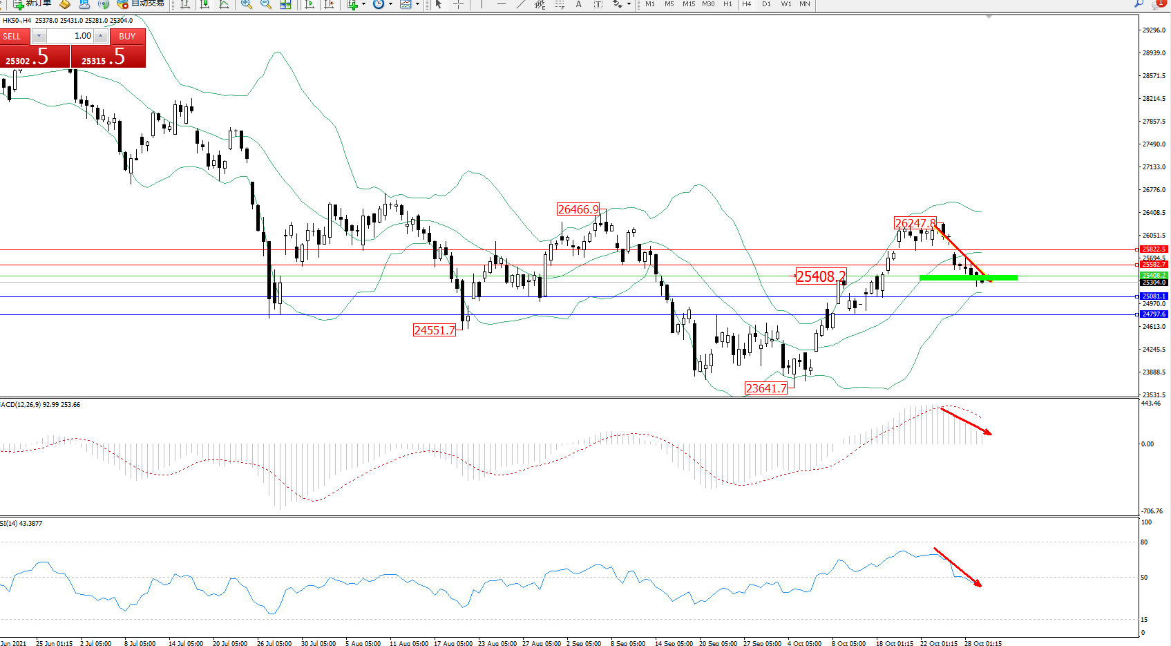 香港恒生指数10月29日(周五)收盘下跌178.49点,跌幅0.7%,报25377.24点;港股三大指数集体收跌,科技股走弱致大市情绪低迷,恒生科技指数跌1%报6375点。大型科技股小米跌超2%,网易、腾讯、百度跌超1%,阿里巴巴等皆有跌幅;消费电子股在弱势中崛起,京东方精电劲升超8%,猪价四季度或触底回升,猪肉概念股走强明显,啤酒股、燃气股、军工股表现活跃。今日大市成交额为1262亿港元,南下资金逆势净流入19.7亿港元。
