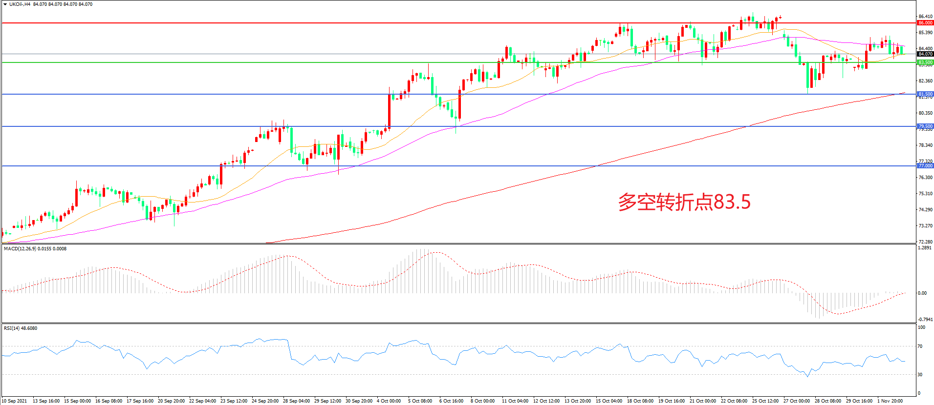 4小时图看,油价以均线系统为依托延续区间震荡,86成为短期阻力,83.5成为下方支撑,MACD红柱缩短,RSI指标走平,日内延续震荡概率较大。