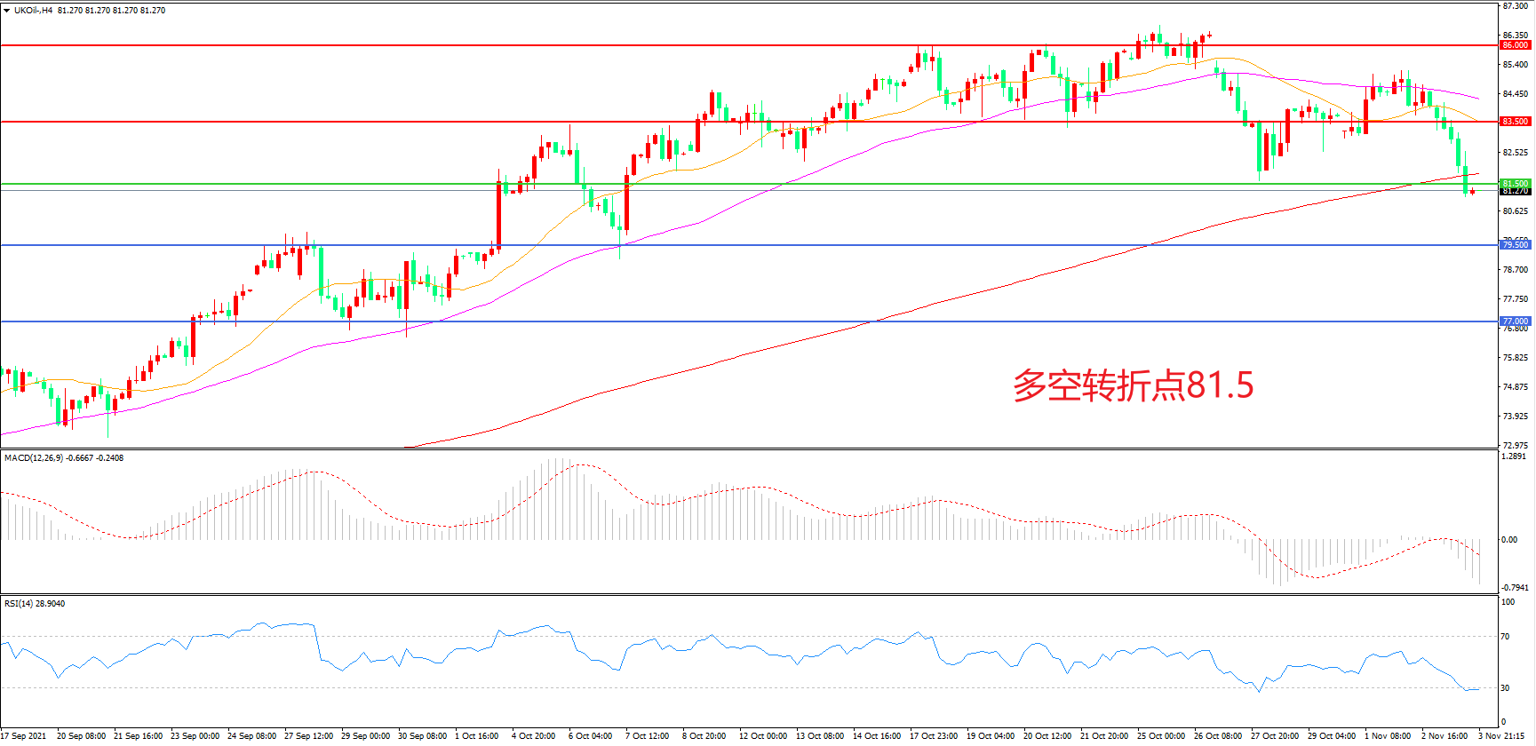 4小时图看,油价高位震荡后连续下破,整体表现低迷,83.5成为短期阻力,81.50成为多空分水岭,MACD绿柱增加,RSI指标走平,日内震荡下行概率较大。