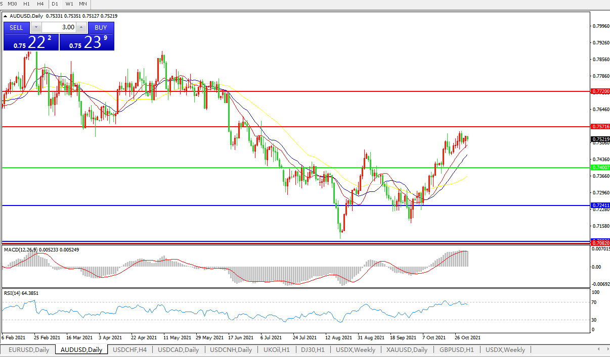 交易策略:0.7400上方看涨,目标0.7570、0.7720