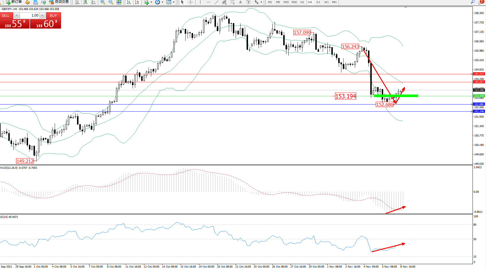 技术点评:空头动力维持布林带指标通道中下轨区间持续震荡下行,低位抵达152.686位置后开始整理回升即将触及布林带指标中轨附近节点,布林带指标呈向下移动走势后开始收口,MACD指标处于空头区域低位震荡缓慢上移,RSI指标处于空头区域低位震荡徘徊向上移动中;
