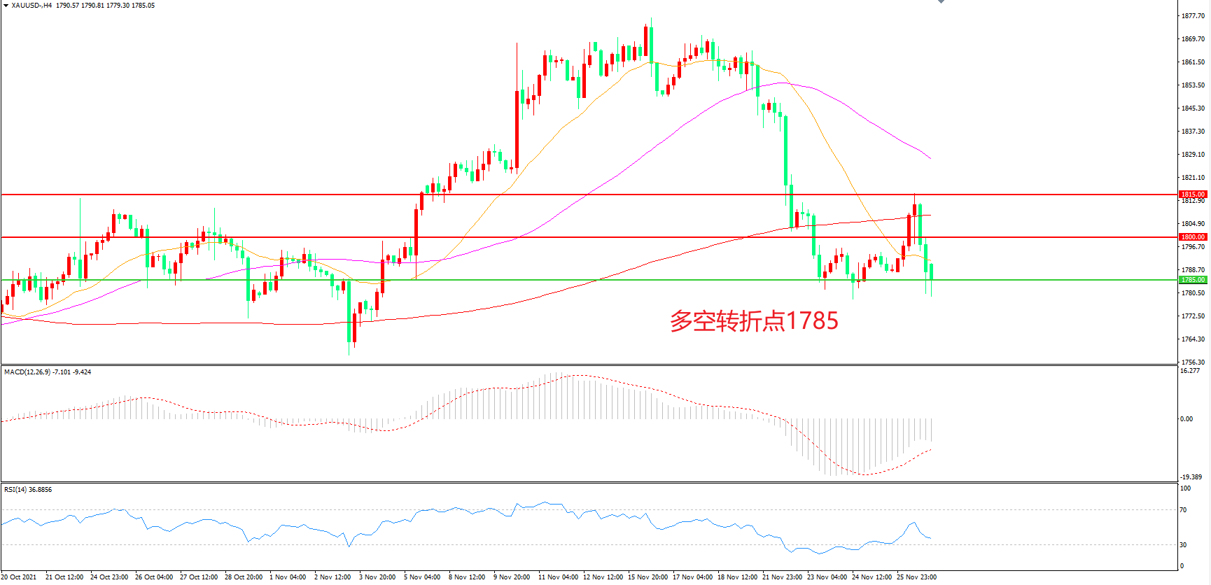 4小时图看,金价触碰1815阻力后再度下破,短期走势偏空,1785成为短期多空分水岭,MACD绿柱缩短,RSI指标走平,日内震荡下行概率较大。