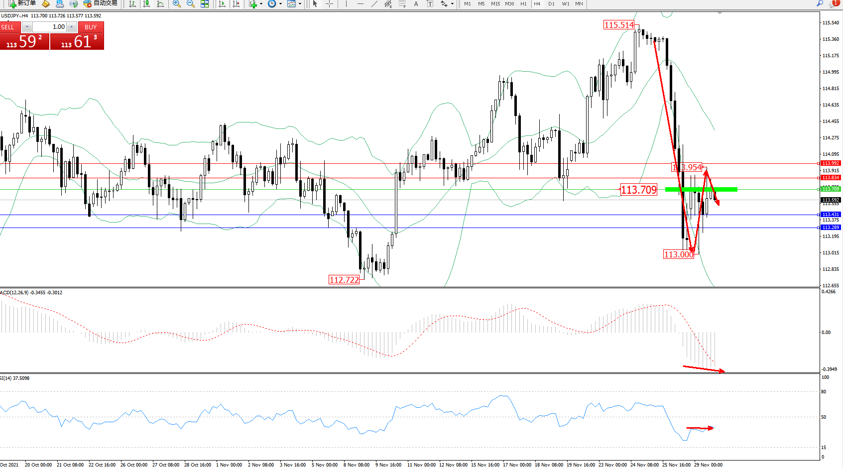 技术点评:空头动力急速下挫后,低位113附近得到支撑反转震荡上移,上方抵达113.954位置节点后再度震荡向下移动,短期空头下行动力或将持续,布林带指标呈张口走势后有缓慢收口迹象,但震荡下行趋势依旧,MACD指标处于空头区域维持低位整理,RSI指标处于空头区域维持整理平移;