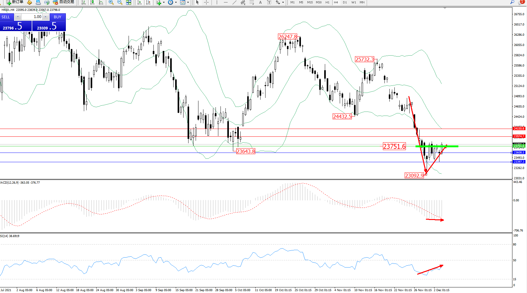 香港恒生指数12月3日(周五)收盘下跌22.24点,跌幅0.09%,报23766.69点;港股三大指数集体收跌,恒指午后一度飘红,恒生科技指数跌1.53%。今日大市成交额为1659亿港元,南下资金净流入44.37亿港元。大型科技股全天表现弱势,阿里巴巴、哔哩哔哩再创上市新低,腾讯、百度、京东等均下挫;煤炭股、电力股拉升领涨,航运费重回涨势,海运股延续强势行情,餐饮股反弹,海底捞涨超7%重回千亿港元。美国确定《外国公司问责法案》实施规则,这意味着针对中概股公司监管的政策已经全部制定完成,正式进入实质性执行阶段,市场或预期将会有更多的中国公司回港上市。另外,滴滴宣布启动在香港上市的准备工作,有媒体称滴滴出行的目标是在明年3月左右在香港提交IPO招股书。