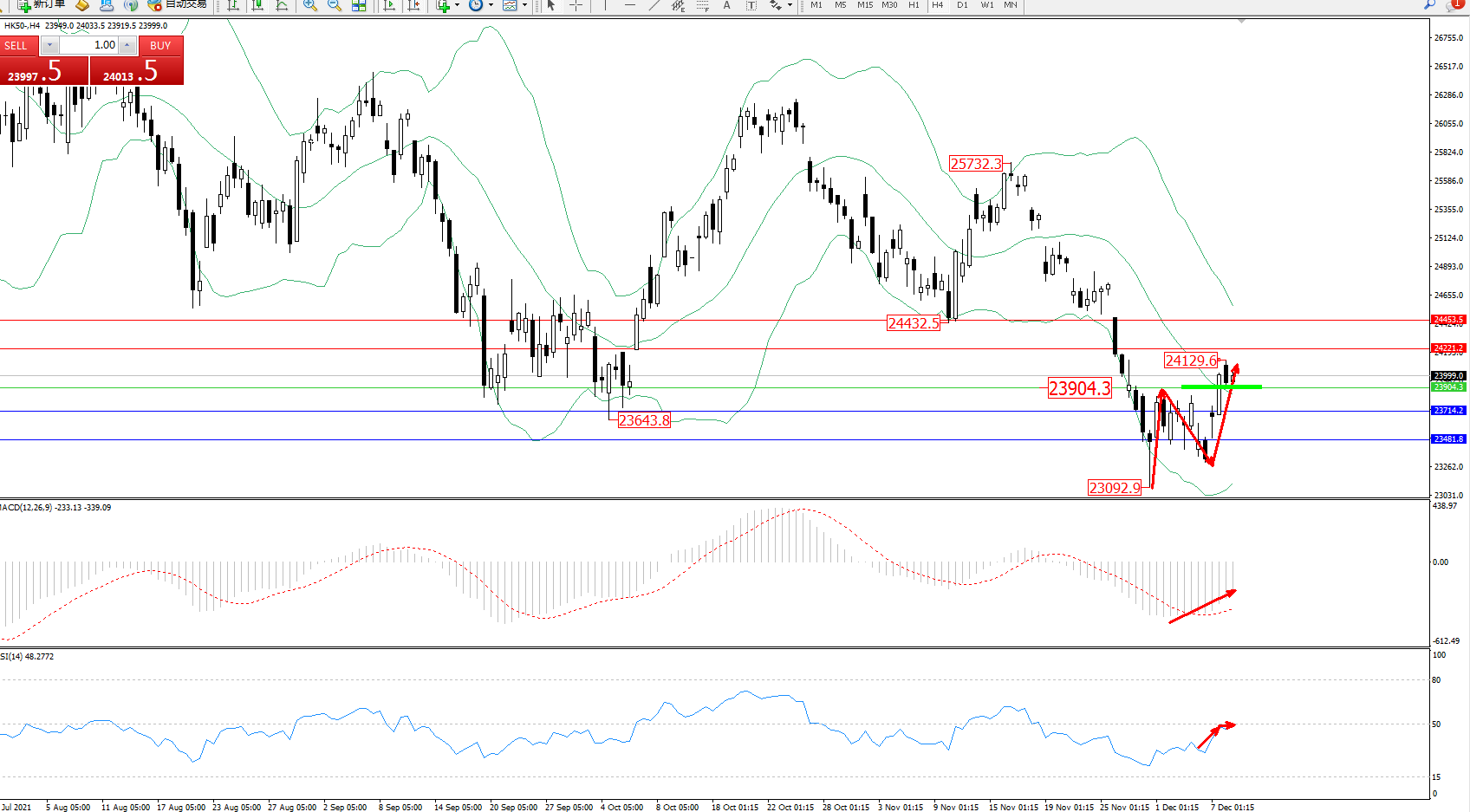 技术点评:空头动力延续布林带指标下轨附近持续下探,低位抵达23092位置后,多头动力有进一步向上拉升态势,突破布林带指标中轨位置后开始短暂整理,布林带指标呈收口走势后有反转上移迹象,MACD指标处于空头区域维持整理缓慢上移,RSI指标处于空头区域持续震荡上移至50均衡线附近弱势徘徊中;