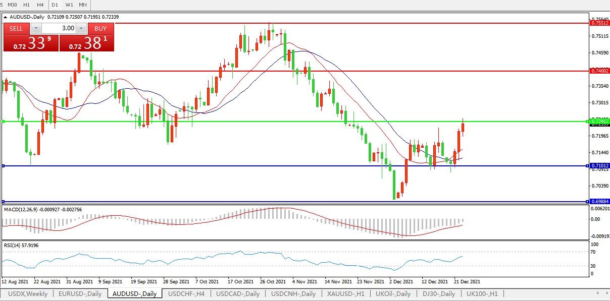 备选策略:0.7240上方看涨,目标0.7400、0.7550
