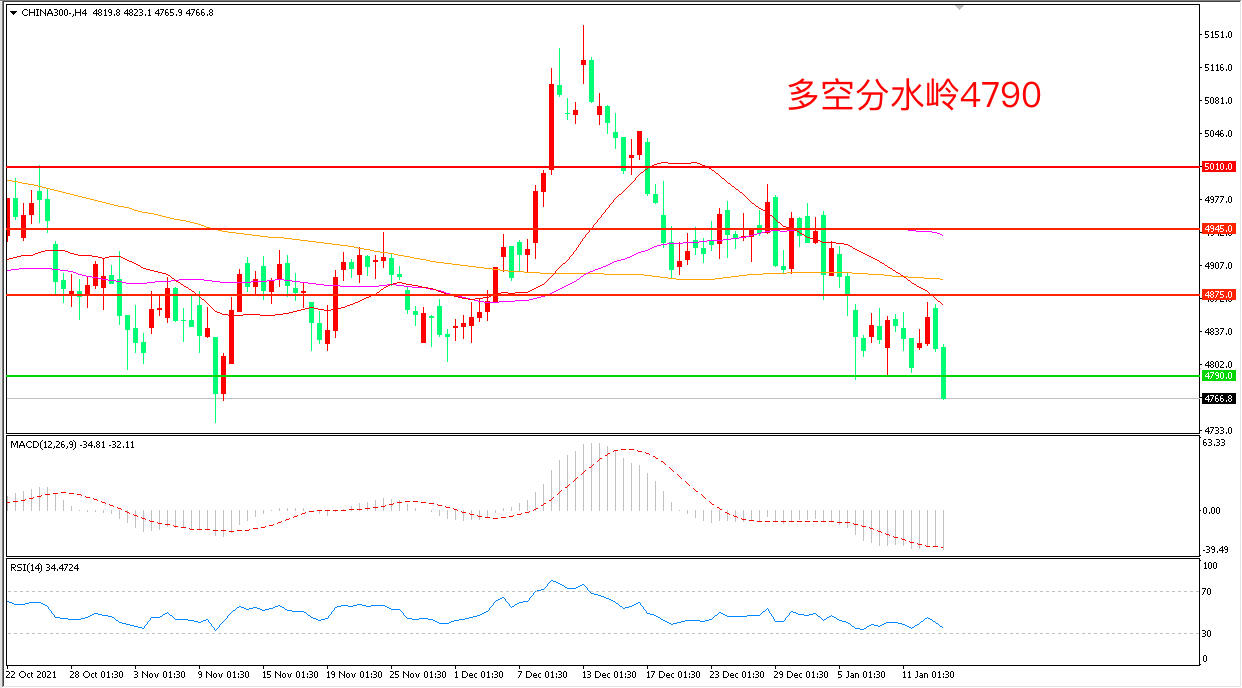 4小时图看,沪深300低开低走,跌破前期整理区间,整体表现较弱,均线系统呈空头排列,MACD绿柱增加,RSI指标走平,日内延续下行概率较大。
