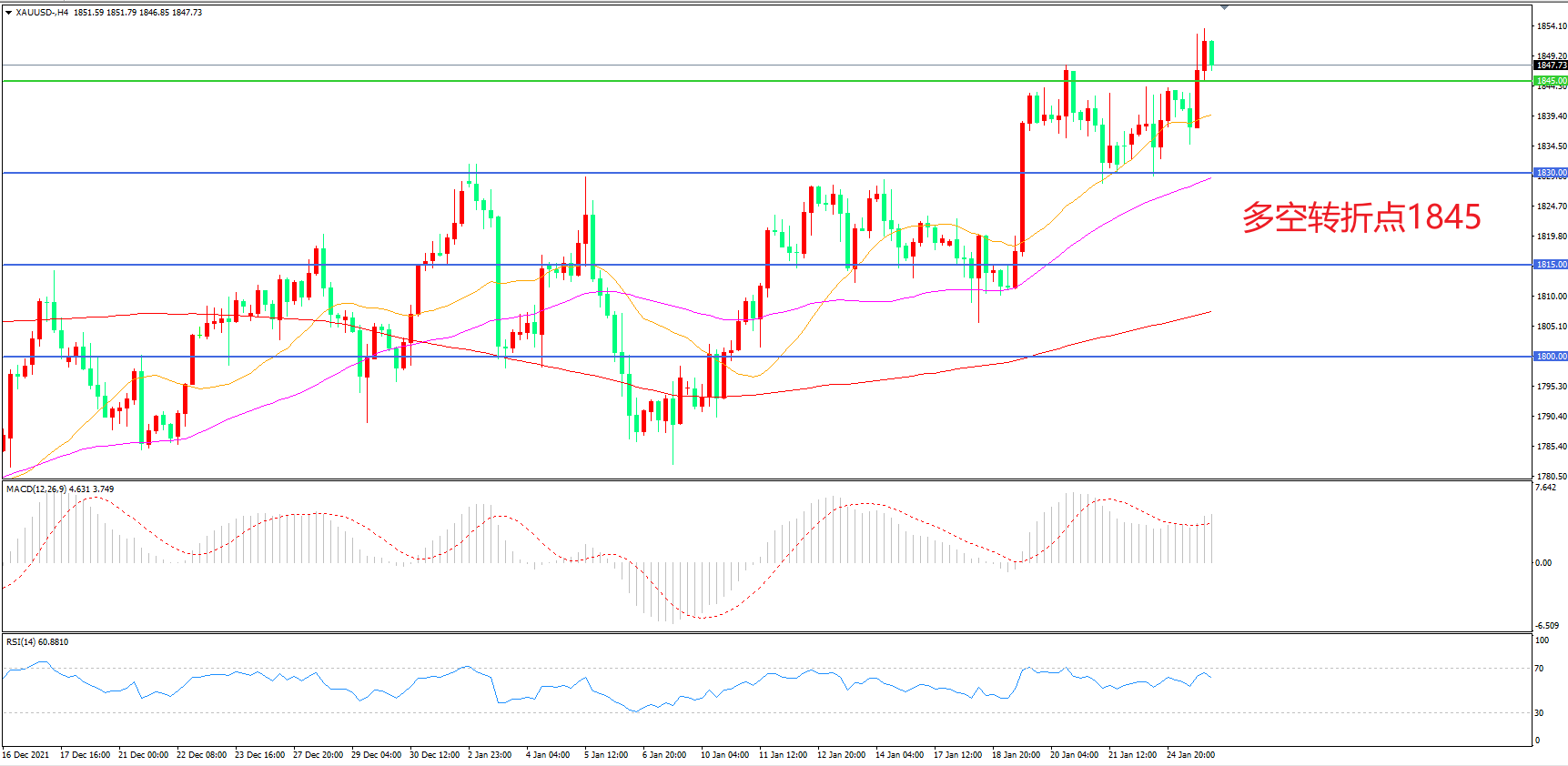 4小时图看,金价阳线连续拉升,短期走势偏强,1845成为多空分水岭,MACD红柱增加,RSI指标走平,日内延续上行概率较大。