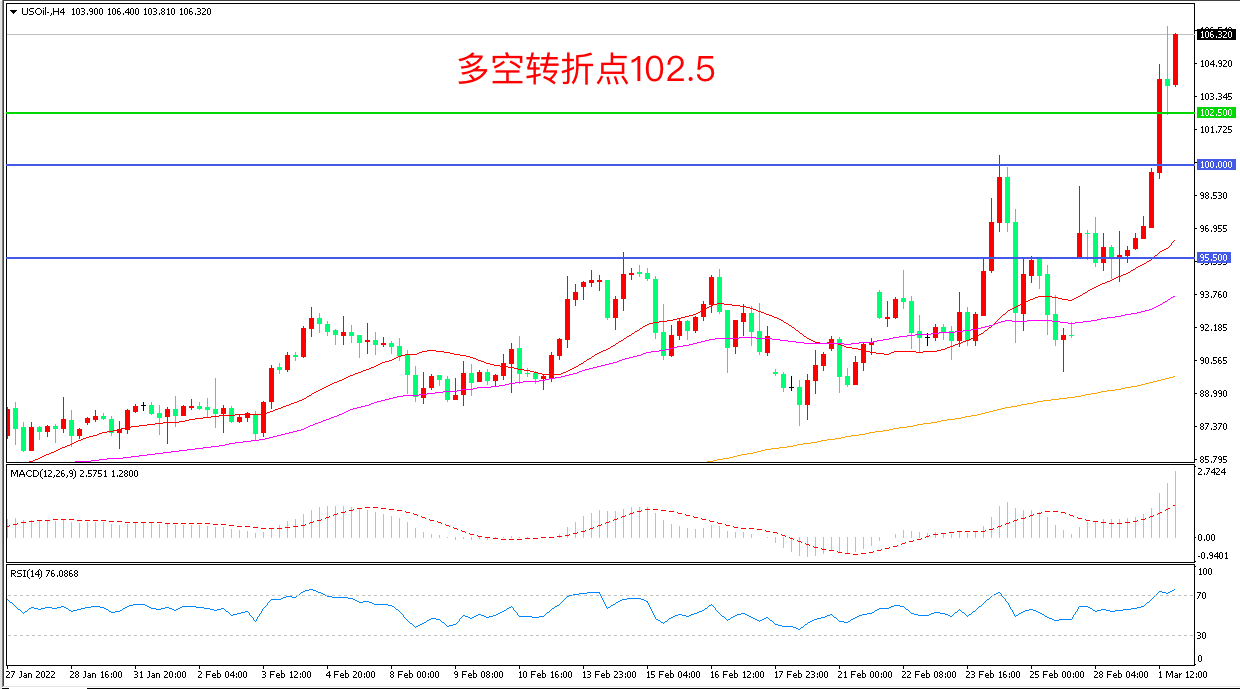 周二(3月1日),一方面担心俄罗斯可能释放紧急储备,另一方面担心俄罗斯能源出口中断,油价上演“疯狂时刻” 美国WTI原油飙升超过10%,收报106.32美元/桶,为2014年以来的首次。虽然美国政府和IEA释放油储的决定显示了石油消费大国遏制油价的决心,但市场更担忧俄罗斯供应中断这个风险,油价已进入非理性的上涨阶段。