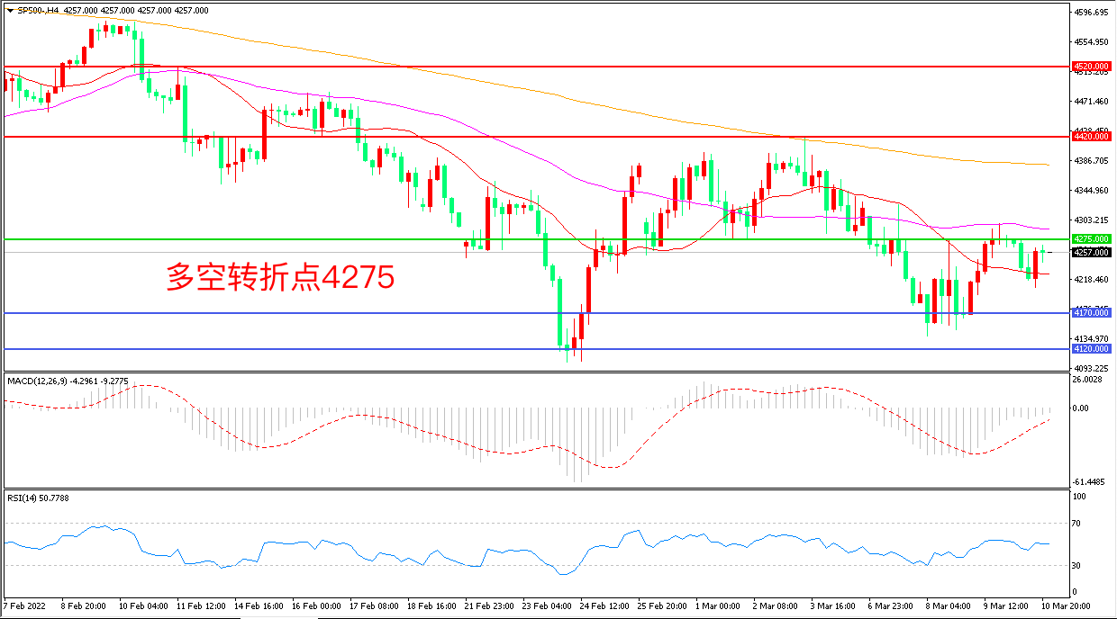 周四(3月10日),随着俄乌局势重新笼罩战争阴霾、美国通胀的“灾难式”预期,避险情绪回归,标普500自高位震荡回落,收报4267.00点。在俄乌冲突升级后围绕货币政策的不确定性挥之不去的情况下,交易者很难把握经济增长的路径,而美国CPI超预期增长续创四十年来增速新高給未来加息前景增加更多的不确定行,多空博弈下,美股宽幅震荡概率较大。