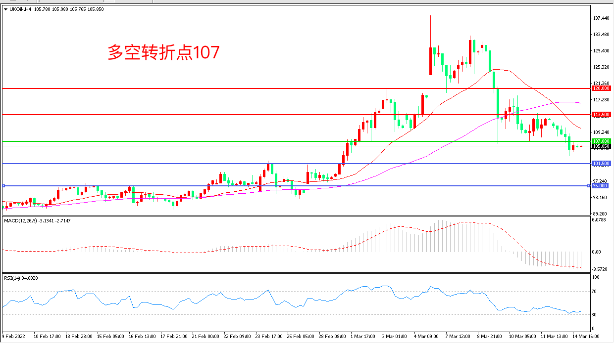 4小时图看,油价触碰113.5一线后连续下破,短期走势偏弱,101.5美元成为下方支撑,107美元成为多空分水岭,MACD绿柱增加,RSI指标走平,日内延续震荡概率较大。