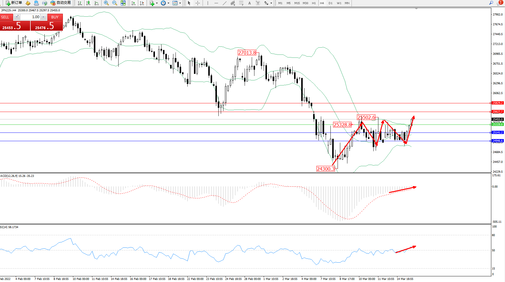 日经225指数3月15日(周二)收盘上涨40.65点,涨幅0.16%,报25348.50点。日本央行高级官员:日本央行将维持大规模货币刺激,因为它可能需要一段时间才能实现价格目标。主要由能源成本推动的日本通胀预期上升,不会导致通胀朝着2%的目标持续稳步上升。日本央行将维持强有力的货币宽松政策,因为日本的工资、物价可能保持低迷;日本央行将审查其政策对市场的影响。