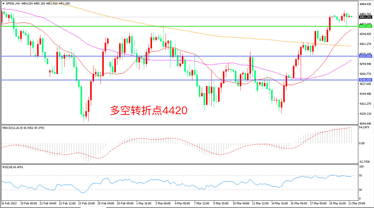 4小时图看,标普500长阳拉升后回踩4420,短期走势偏强,均线系统呈多头排列,MACD红柱增加,RSI指标走平,日内震荡上行概率较大。