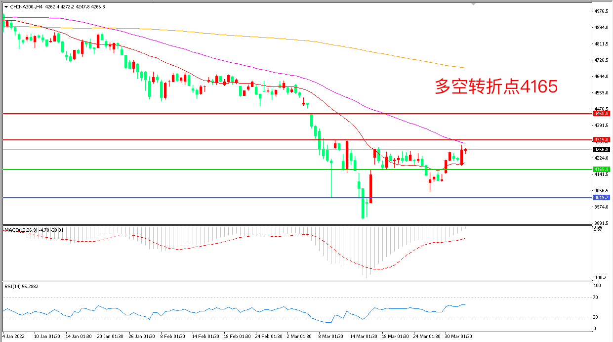 4小时图看,沪深300以21周期均线为依托再度拉升,短线走势偏强, MACD绿柱缩短,RSI指标走平,日内震荡上行概率较大。