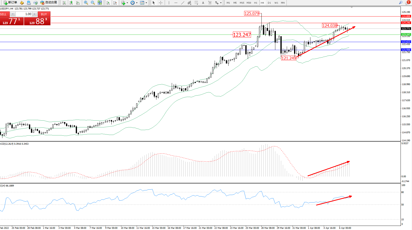 技术点评:多头动力延续布林带指标通道中上轨区间持续震荡上扬,高位抵达124.038附近节点后开始整理,短期多头拉升上扬动力或将延续,布林带指标呈上行趋势走势良好,MACD指标处于多头区域维持震荡缓慢上移,RSI指标处于多头区域维持弱势上移后开始徘徊中;