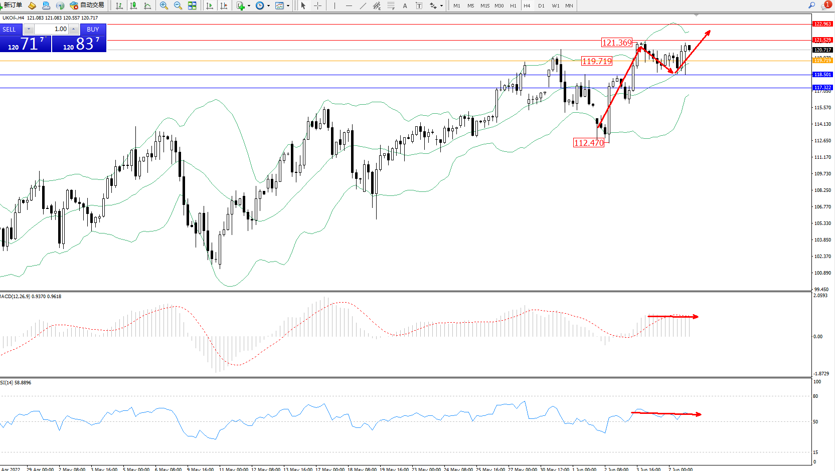 布油维持120.717附近震荡,欧盟委员会公布第六轮对俄罗斯制裁,其中的石油禁运措施将导致到2022年底欧盟从俄罗斯进口的石油减少90%。同时,美国也面临着燃料供应的压力,油价一度飙升至历史高位。眼下,欧美不得不展开自救行动,加紧脚步寻找俄罗斯石油的替代来源。