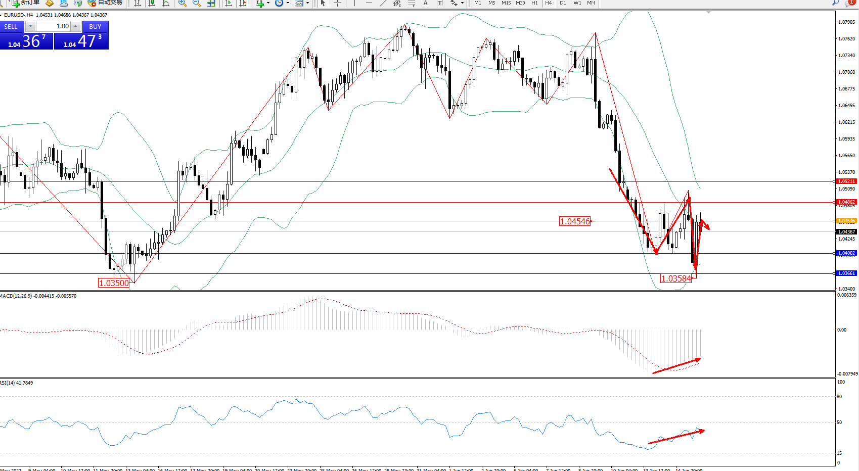 欧元美元EURUSD—4小时K线图显示: