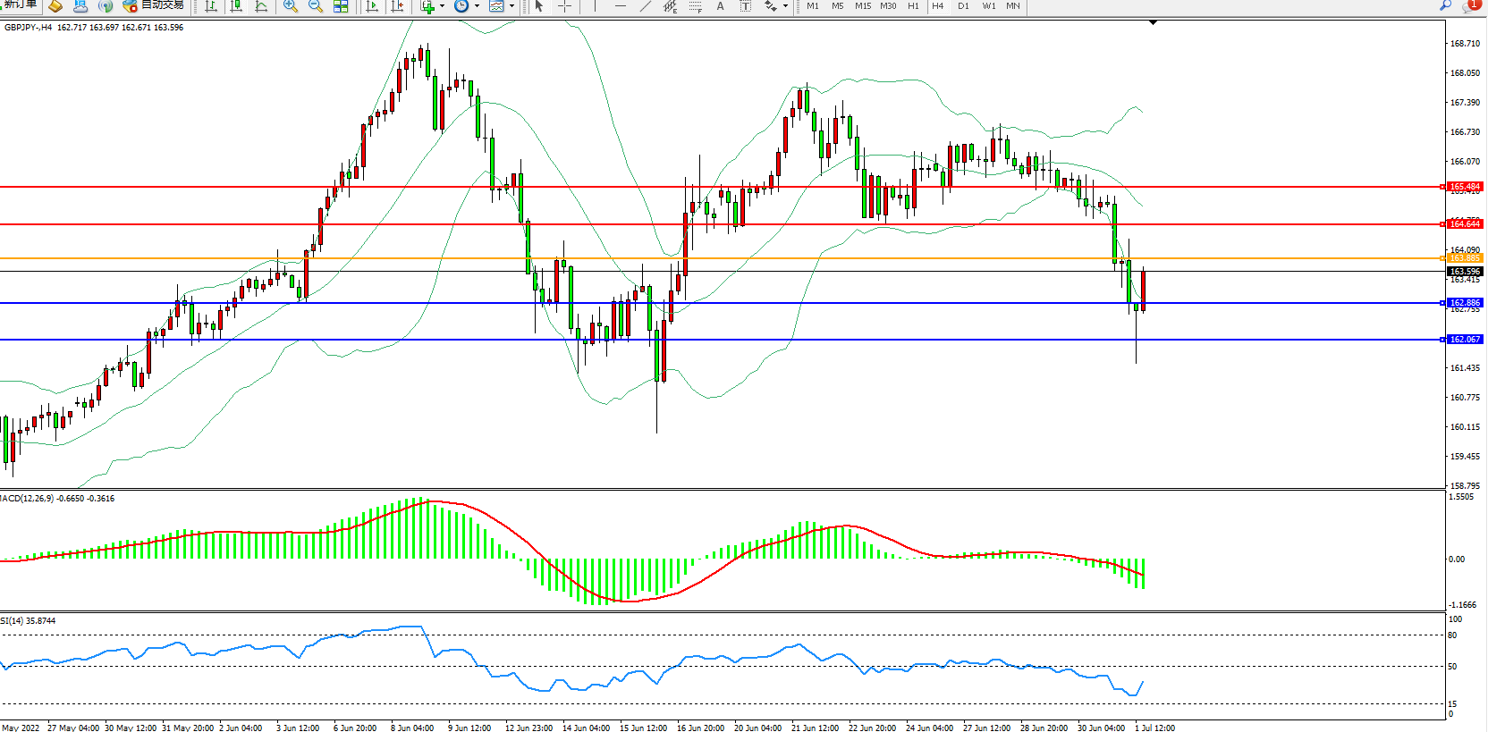 4小时图看:空头动力延续布林带指标下轨附近持续震荡下挫,低位下穿下轨后急速回升,呈V型反转走势,布林带指标呈张口走势后开始有缓慢收口迹象,MACD指标处于0轴线下方弱势徘徊,RSI指标处于50均衡线下侧窄幅震荡;