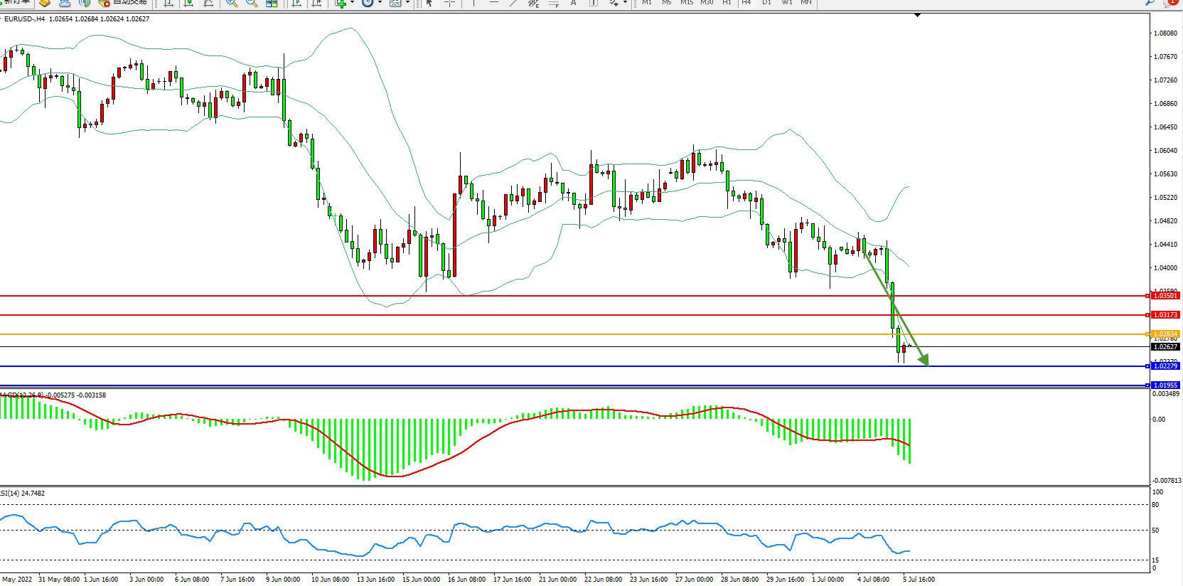 欧元美元EURUSD—4小时K线图显示:
