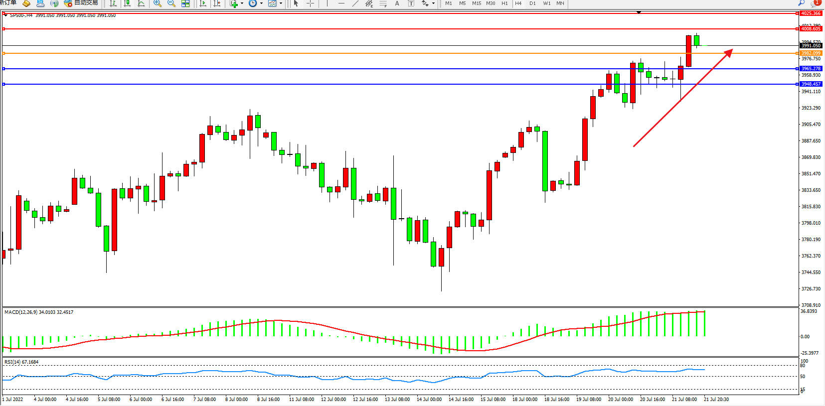 标普SP500——4小时K线图显示: