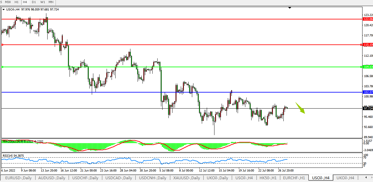 4小时图看:短线价格延续反弹, MACD量能柱0轴附近缩量,RSI指标走势小升,短期价格反弹后继续下行概率较大。