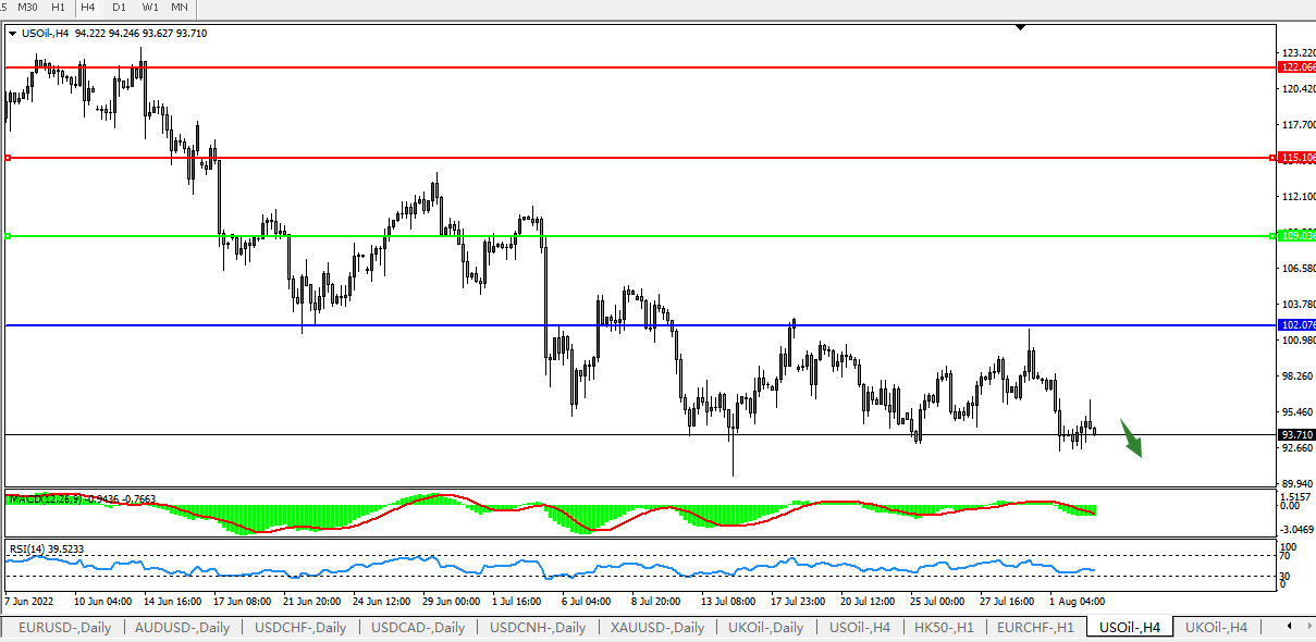4小时图看:油价在阶段性上攻后再度回落且价格靠近整理区间下沿, MACD量能柱0轴下方放量,RSI指标走弱,短期价格继续下行概率较大。