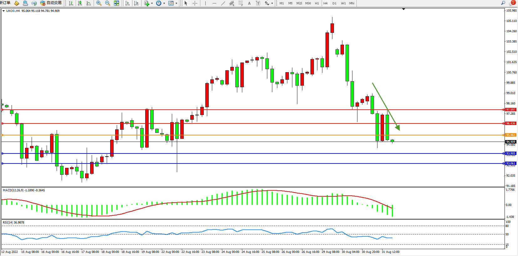 布油维持94.909附近震荡,EIA报告:美国截至8月26日当周EIA原油库存超预期下降,除却战略储备的商业原油库存减少332.6万桶至4.18亿桶,降幅0.79%。