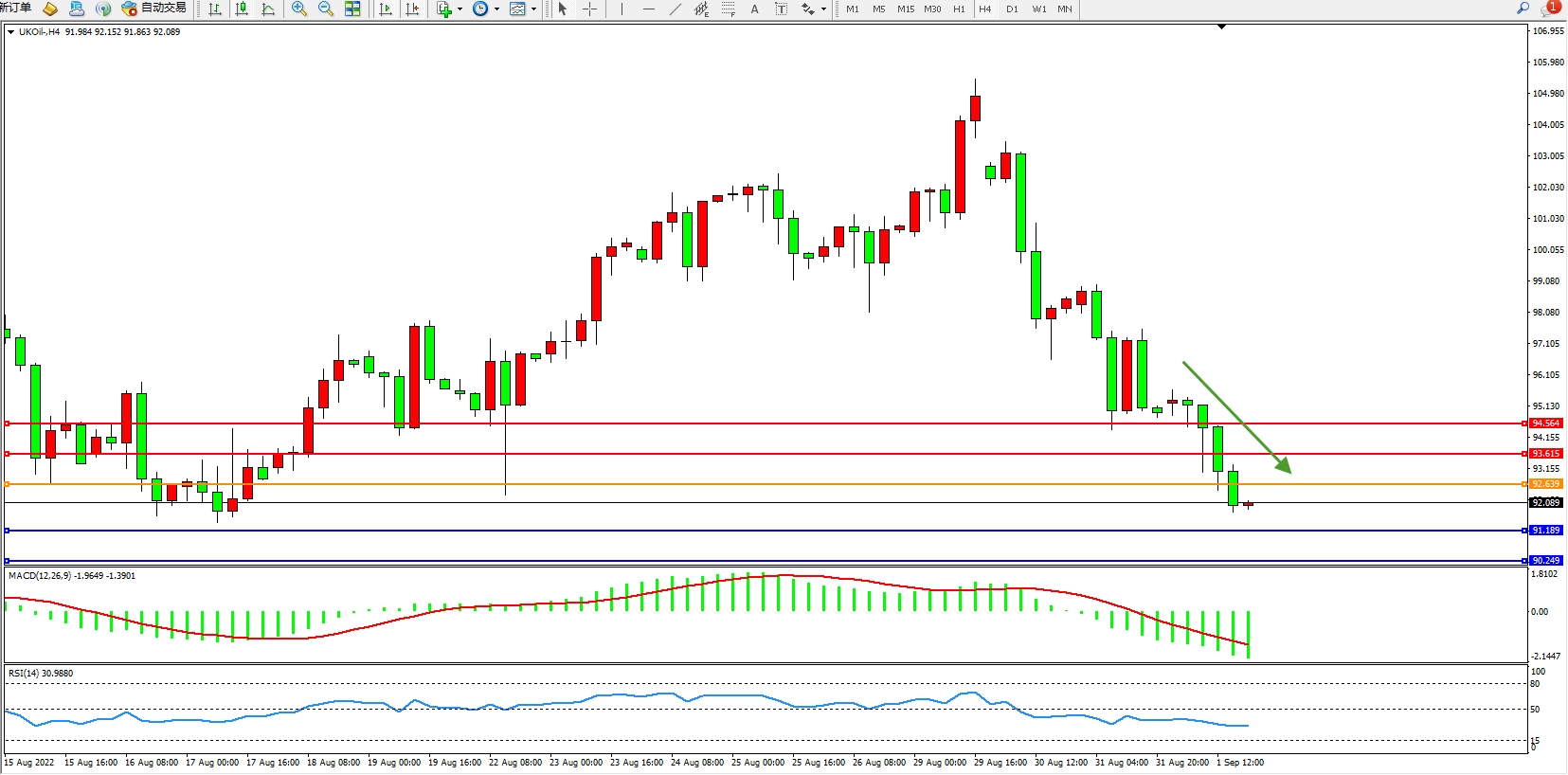 交易策略:92.639下方看跌,目标91.189、90.249