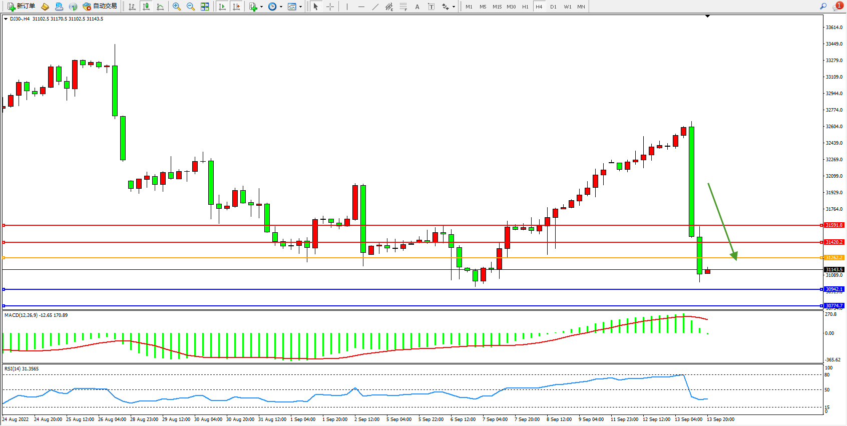 道琼斯指数9月13日(周二)收盘下跌1276.37点,跌幅3.94%,报31104.97点;美国8月CPI环比上升0.1%给美联储带来了问题。政策制定者对物价上涨无能为力,提高利率对减缓食品价格的作用有限。
