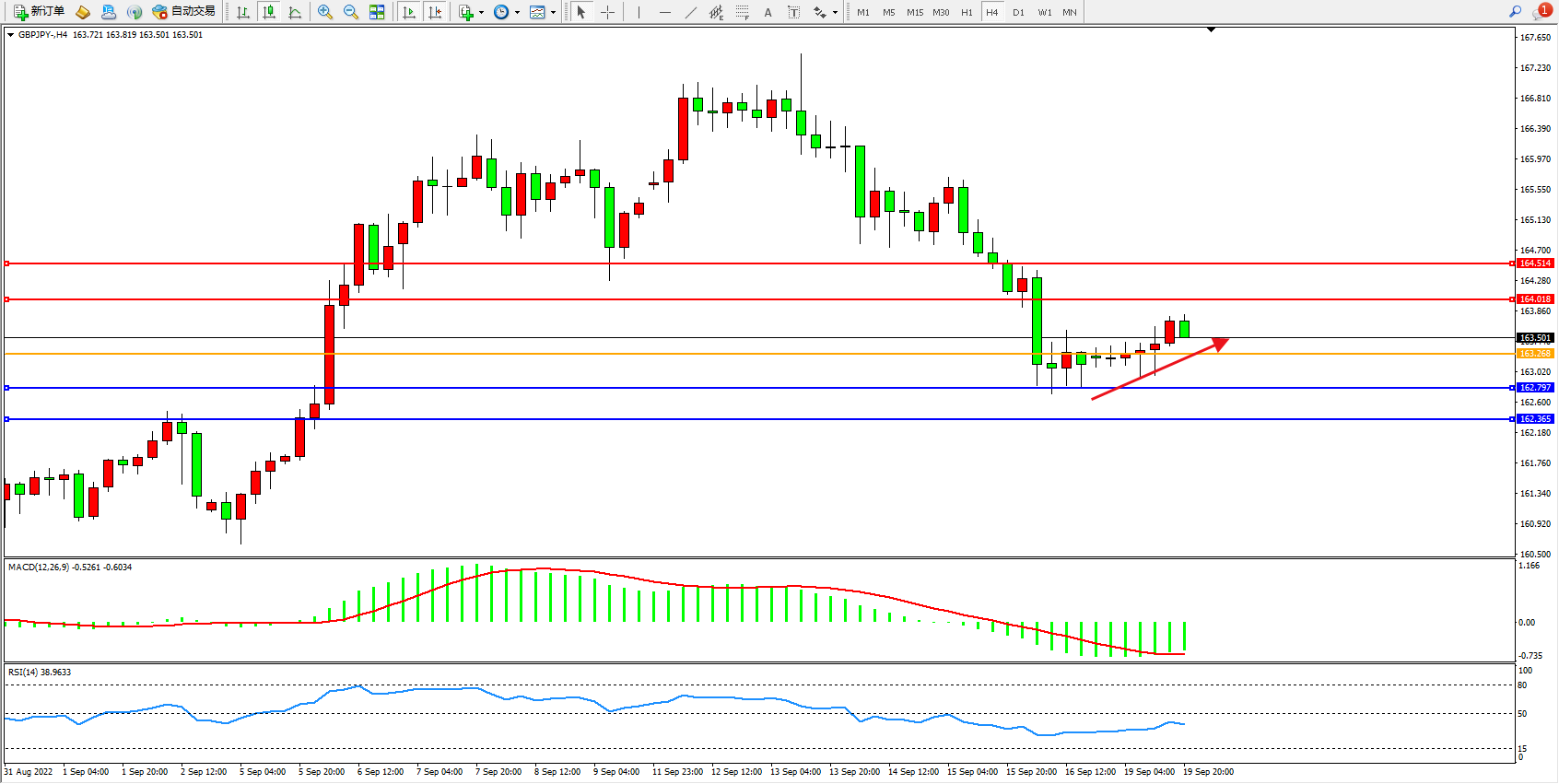交易策略:163.268上方看涨,目标164.018、164.514