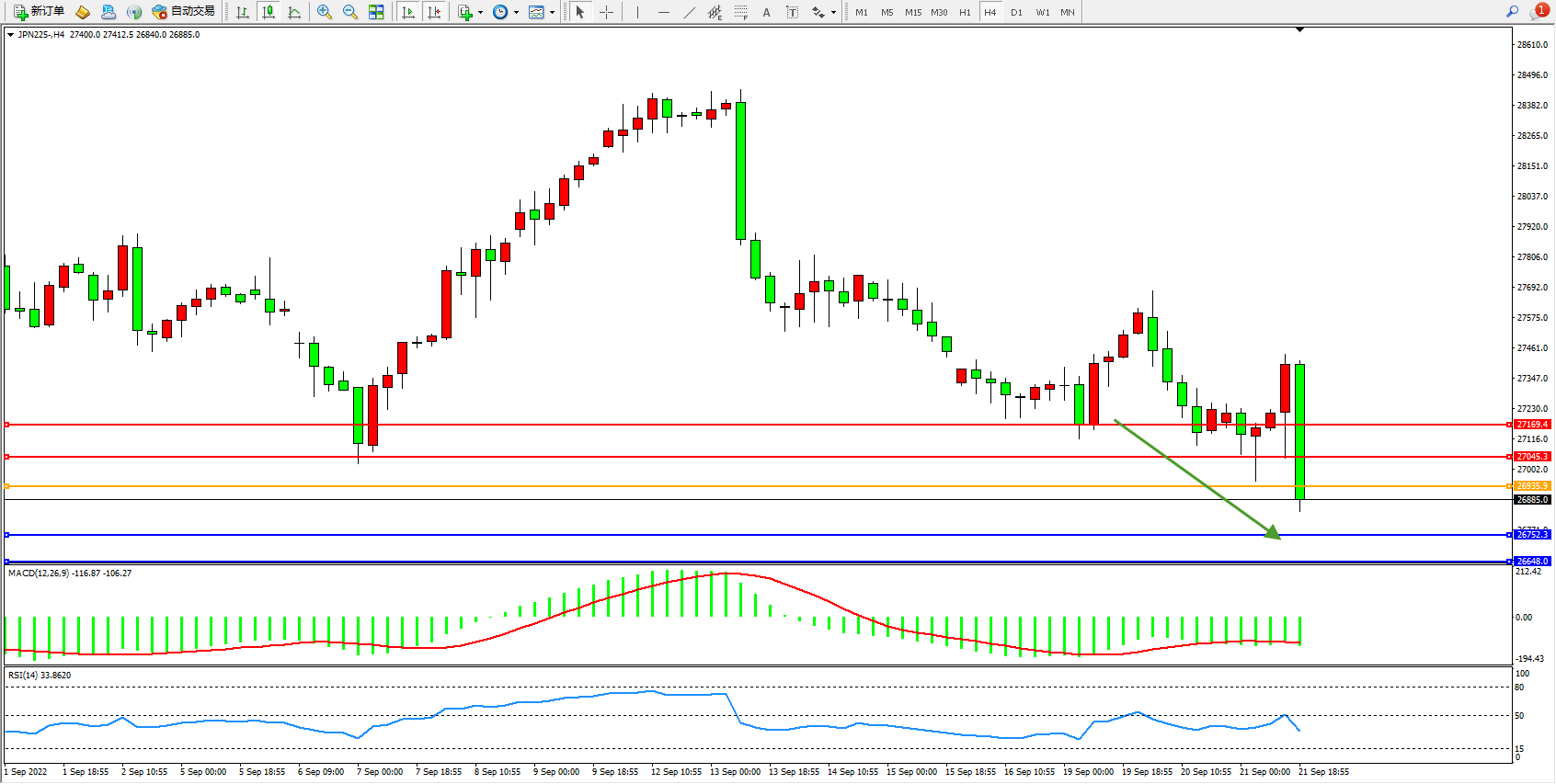 日经225指数9月21日(周三)收盘下跌362.42点,跌幅1.31%,报27326.00点。日本央行超宽松政策与全球其他央行迅速收紧政策之间的差距扩大,促使决策者本月表明准备好采取行动来因应波动的汇率走势。