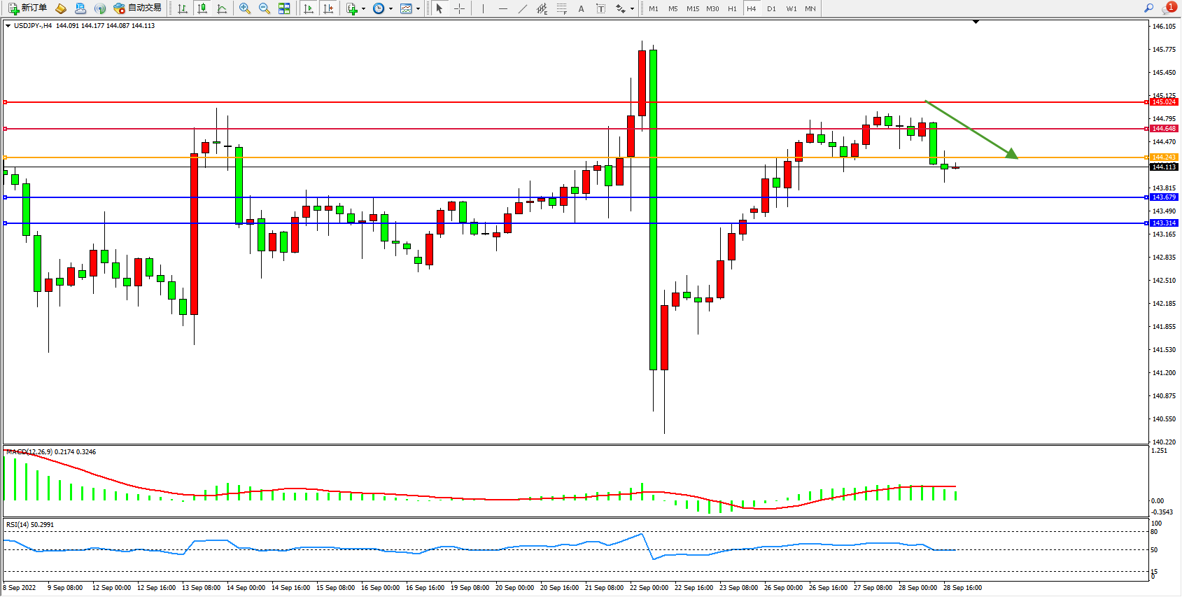 交易策略:144.243下方看跌,目标146.679、143.314