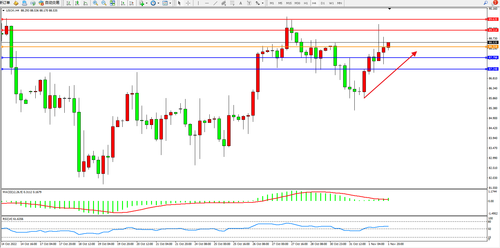 交易策略:88.318上方看涨,目标89.114、89.635