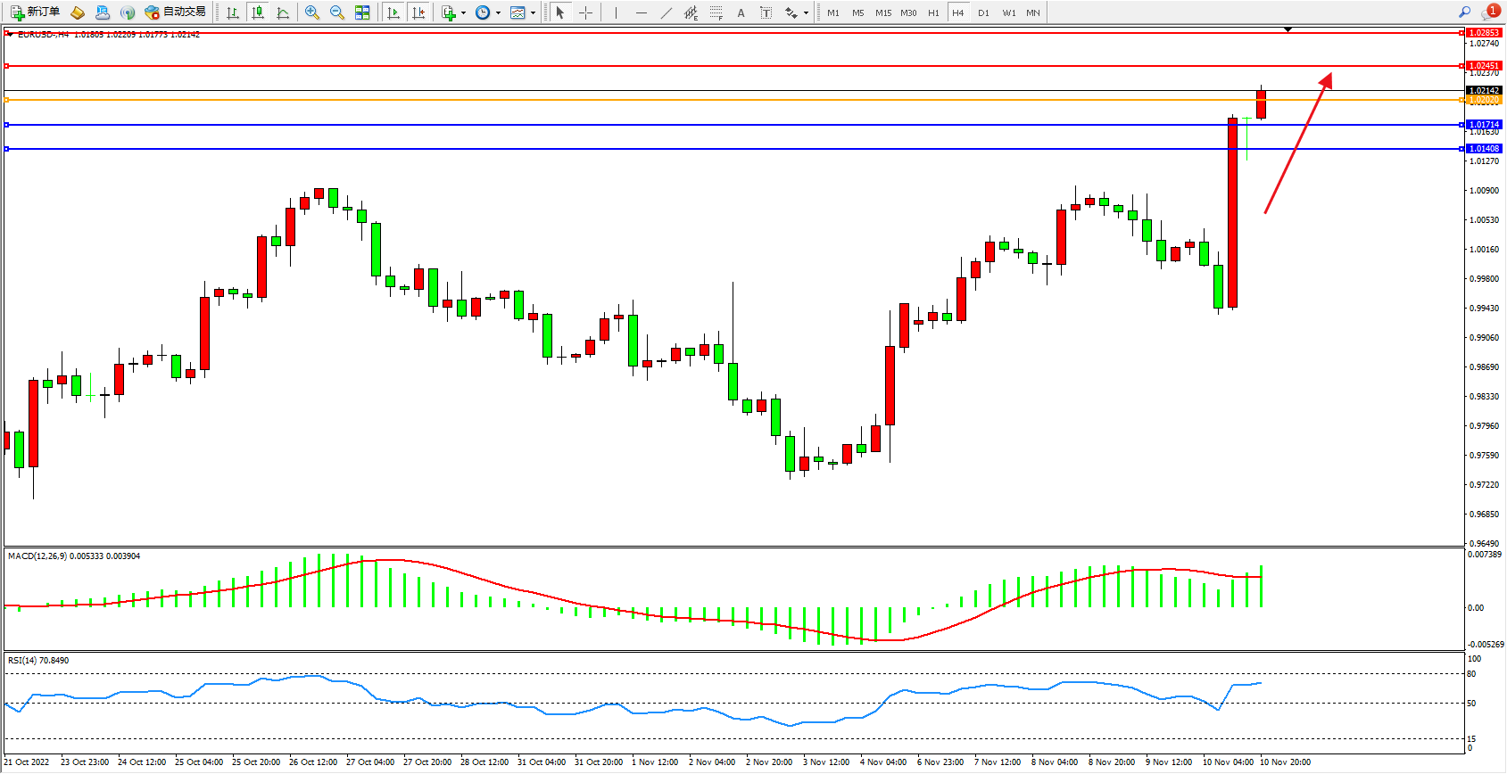 欧元美元EURUSD—4小时K线图显示: