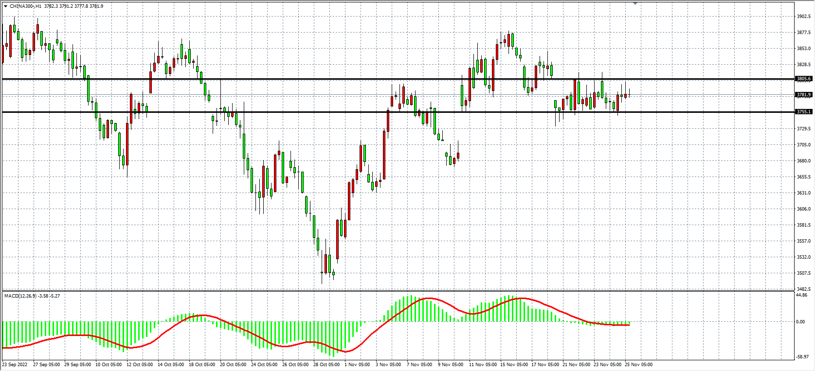 1小时图看,沪深300在回调3755后再度止跌,目前于3755-3800间形成盘整走势,MACD量能柱在零轴附近缩量,若上破3800目标上看3850-3900,跌破3755则下看3700-3600。