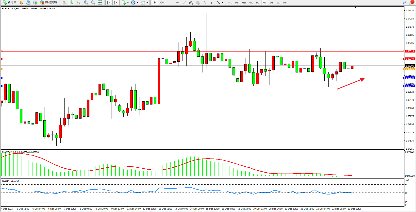 欧元兑美元维持1.06201附近震荡,欧洲央行上调利率和通胀高企堪忧表明欧元区处在经济衰退的困境。市场可能低估了通胀的持久性,只能采取行动。短期内加息50个基点可能成为新的常态。周一圣诞节休市一日。