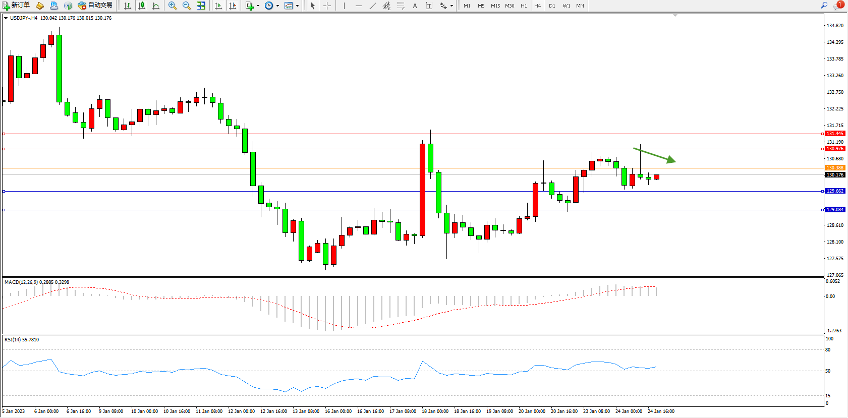 4小时图看:市场空头动力开始伺机入场,短期窄幅整理后缓慢下移,市场整体处于偏弱势中,MACD指标处于多头区域弱势徘徊,RSI指标处于50均衡线上侧弱势整理;