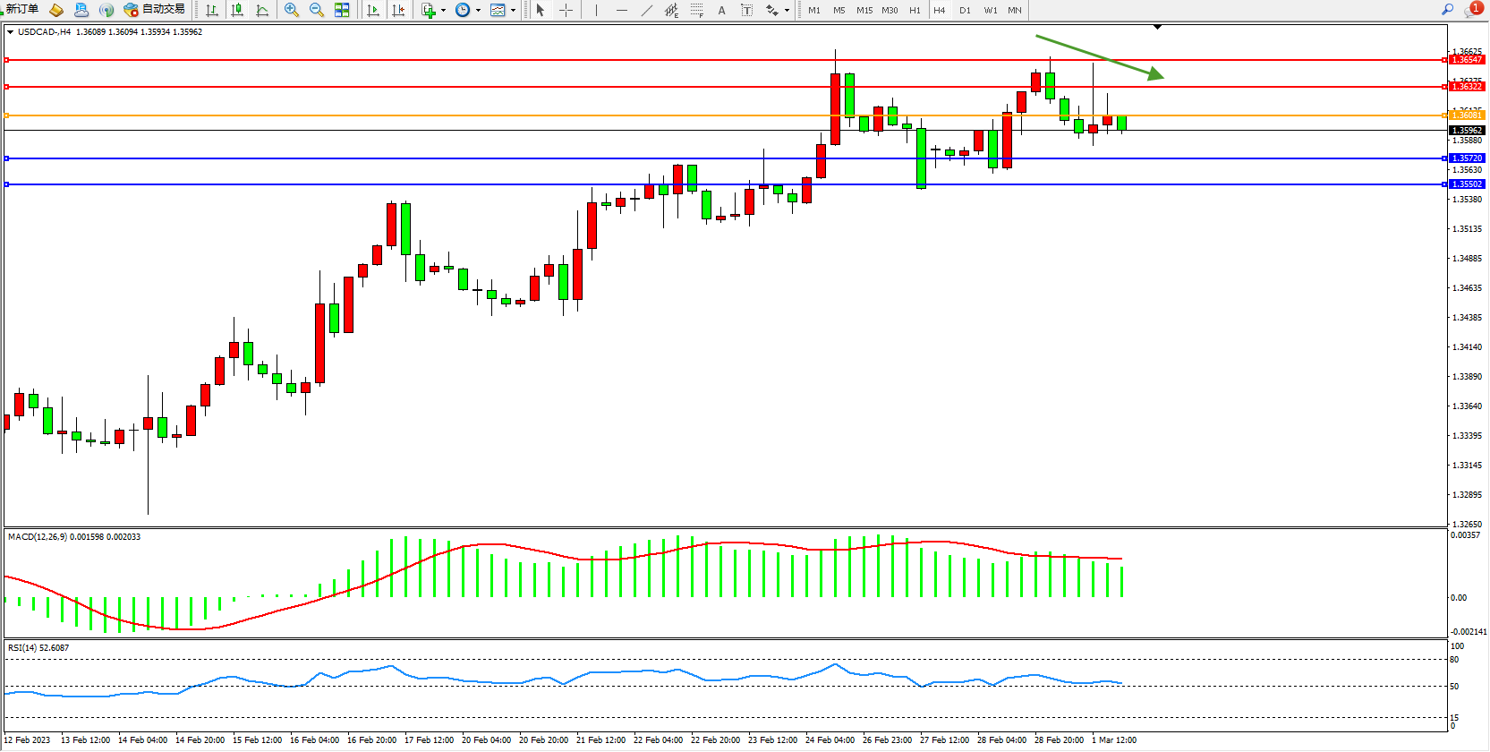 美元加元USDCAD——4小时K线图显示: