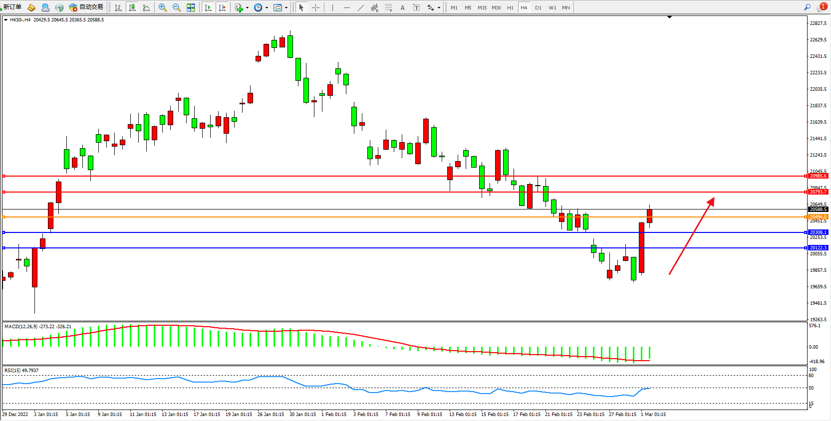 香港恒生指数3月1日(周三)收盘上涨833.77点,涨幅4.21%,报20619.71点;港股三大指数抹平年内涨幅后,3月首日迎来绝地反击行情,恒生科技指数大涨6.64%,恒指、国指分别涨4.21%和5.06%,恒指更是爆拉833点。2月份制造业PMI景气水平继续上升,人民币汇率收复6.9,市场情绪一扫阴霾。作为市场风向标的科技股领衔上扬,网易更是涨超8%,百度、腾讯涨超7%,阿里巴巴、小米、快手涨超6%;南下资金净流入57.45亿港元,大市成交额为1539亿港元。