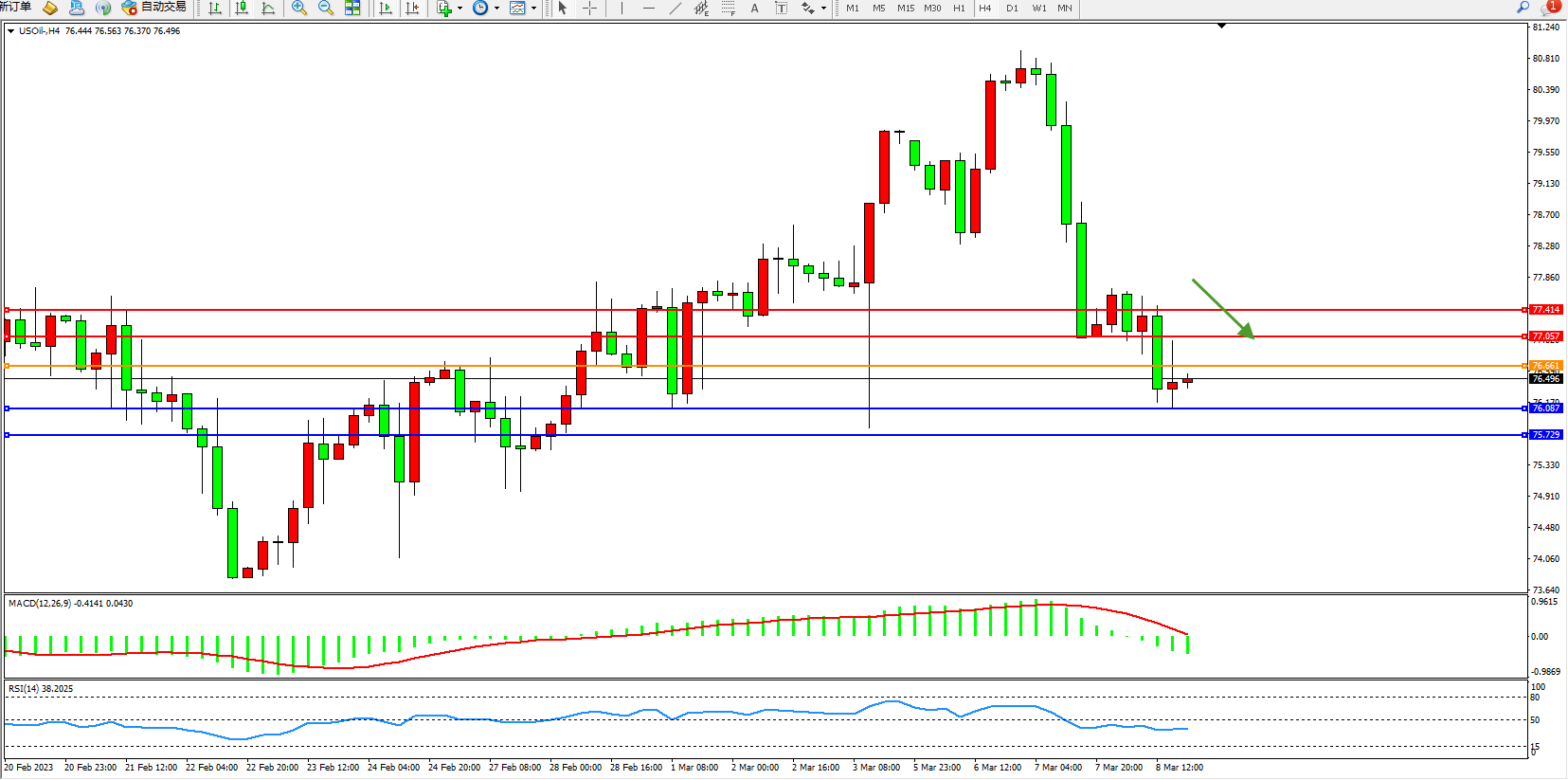 原油维持76.496附近震荡,美国至3月3日当周EIA原油库存 -169.4万桶,预期39.5万桶,前值116.6万桶。俄克拉荷马州库欣原油库存 -89万桶,前值30.7万桶。美国原油产品四周平均供应量为1974.6万桶/日,较去年同期减少8.44%。