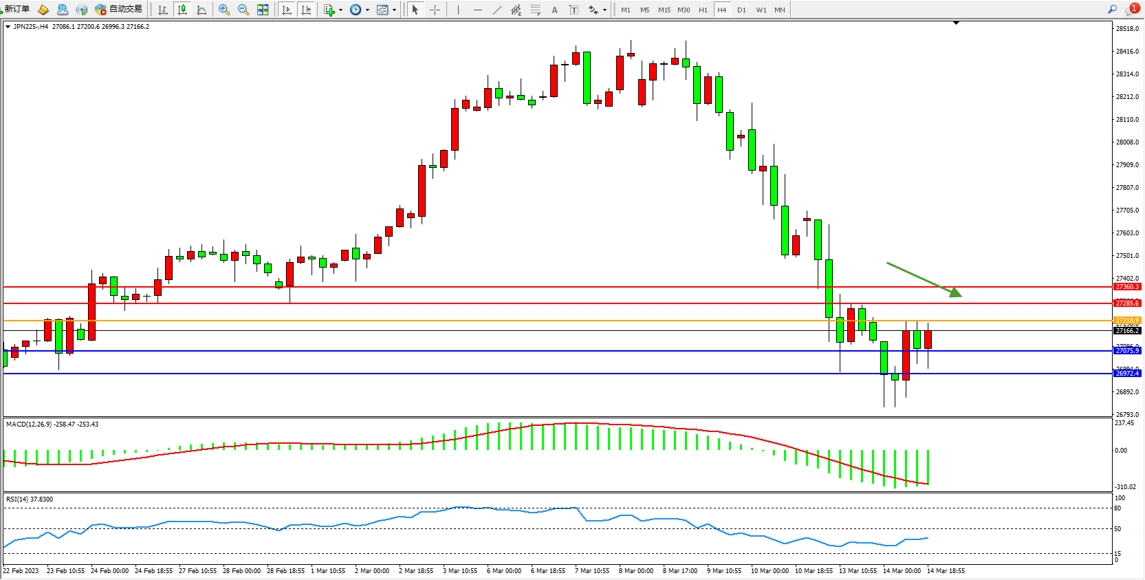 日经225指数3月14日(周二)收盘下跌633.46点,跌幅2.28%,报27199.50点。鉴于美联储在美国银行业危机期间可能按兵不动,越来越多的人猜测日本央行暂时不会调整政策。