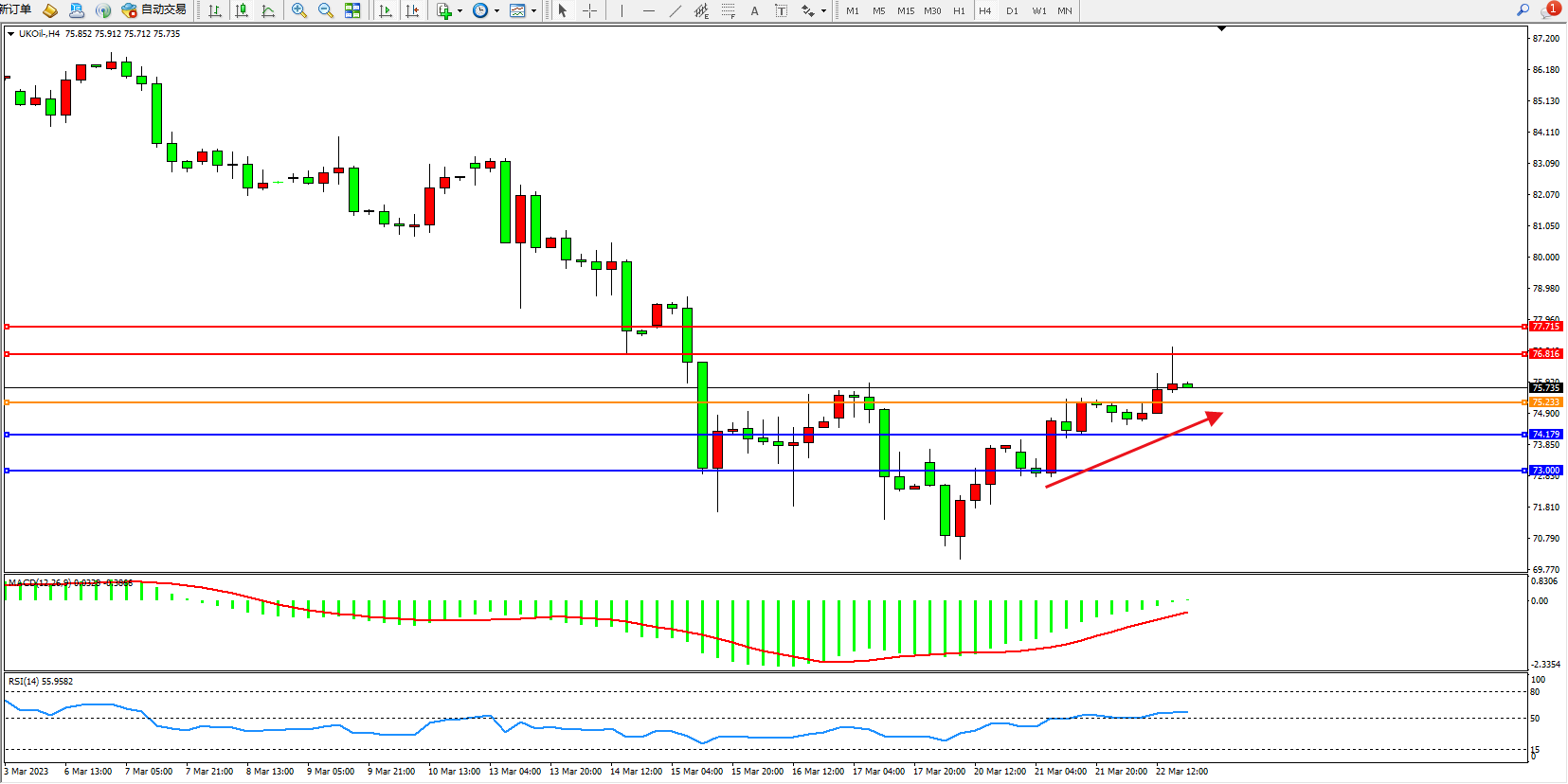 交易策略:75.233上方看涨,目标76.816 77.715
