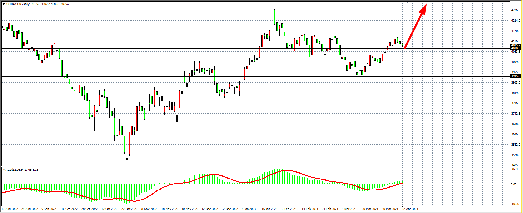 4小时图看,沪深300在4000点之上继续窄幅整理,MACD量能在零轴之上走平,当前趋势仍向上行,支撑继续关注4080附近,该位之上看4150-4200附近。