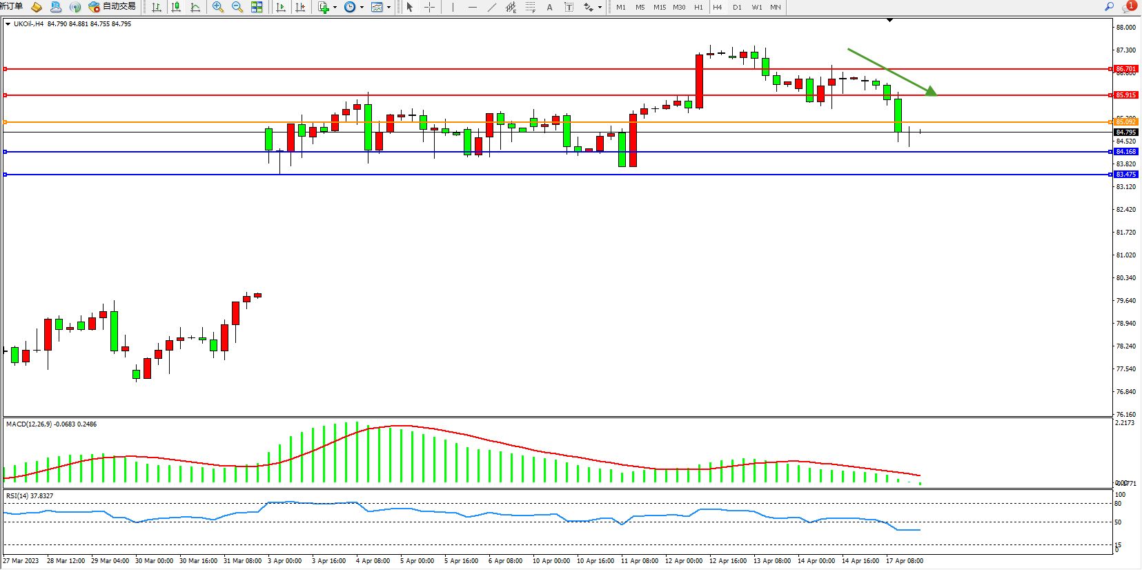4小时图看:高位空头动力震荡向下移动,短期跌势或将延续,市场整体处于高位偏空头走势中,MACD指标处于多头区域缓慢下移至0轴线附近徘徊,RSI指标处于50均衡线下侧弱势整理;