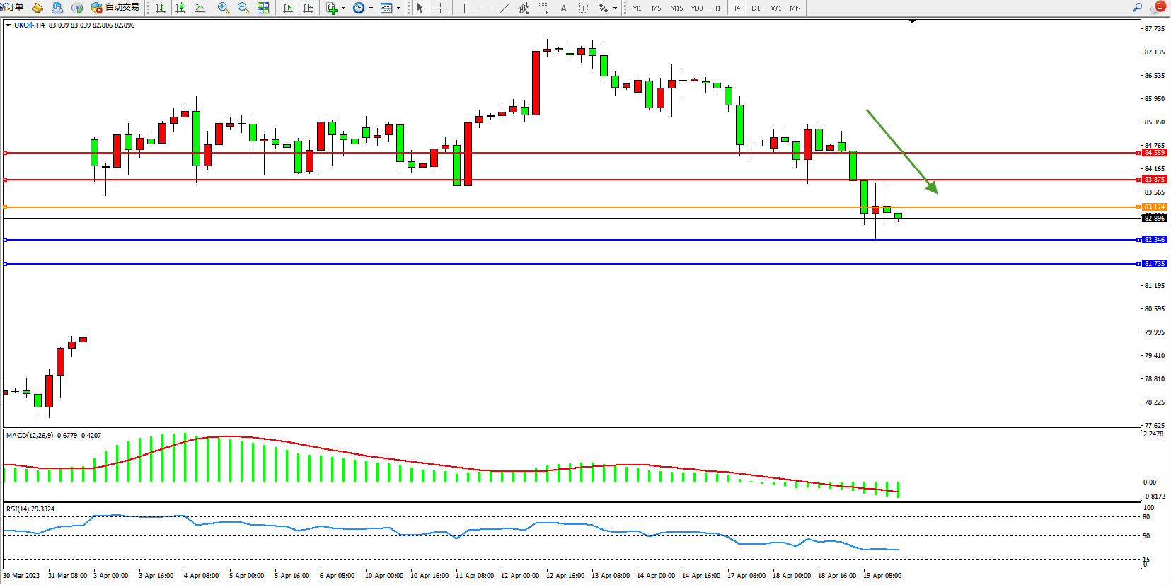 4小时图看:空头动力震荡向下移动,短期跌势或将延续,市场整体处于偏空头走势中,MACD指标处于0轴线下侧缓慢下移,RSI指标处于空头区域整理;