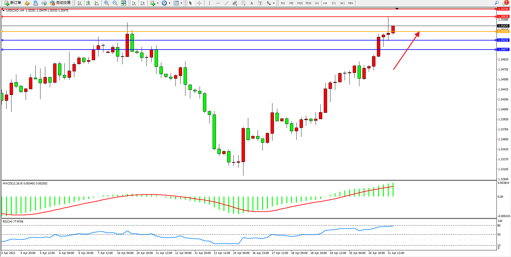 4小时图看:多头动力高位持续震荡上扬,短期多头有继续攀升态势,市场整体不断拉升,且未见有止步迹象,MACD指标处于多头区域持续整理上行,RSI指标处于多头区域超买区80均衡线下侧徘徊;
