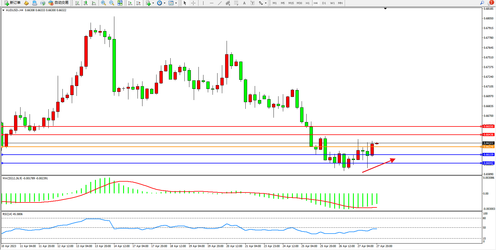 交易策略:0.66270上方看涨,目标0.66436  0.66550